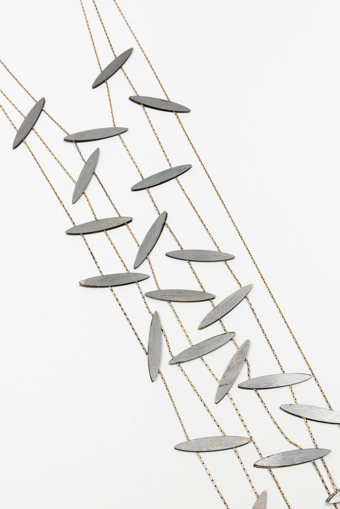 This long necklace stands out for its structure of multiple cascading golden threads, decorated with capsule-shaped silver hardware. Its ethereal and sophisticated design adds movement and subtle shine to any outfit, making it the ideal complement to monochrome styles, loose shirts, or flowing dresses. A versatile piece that provides an artistic and modern feel with a handcrafted touch.