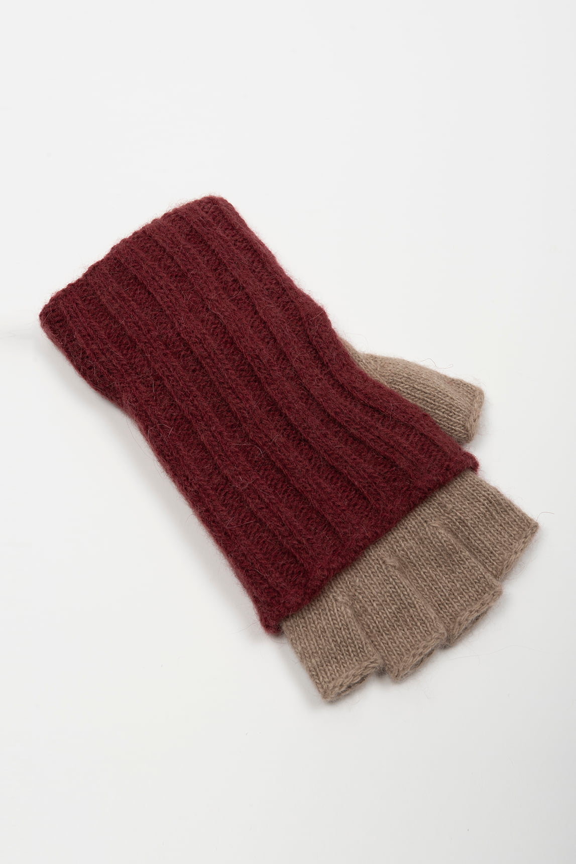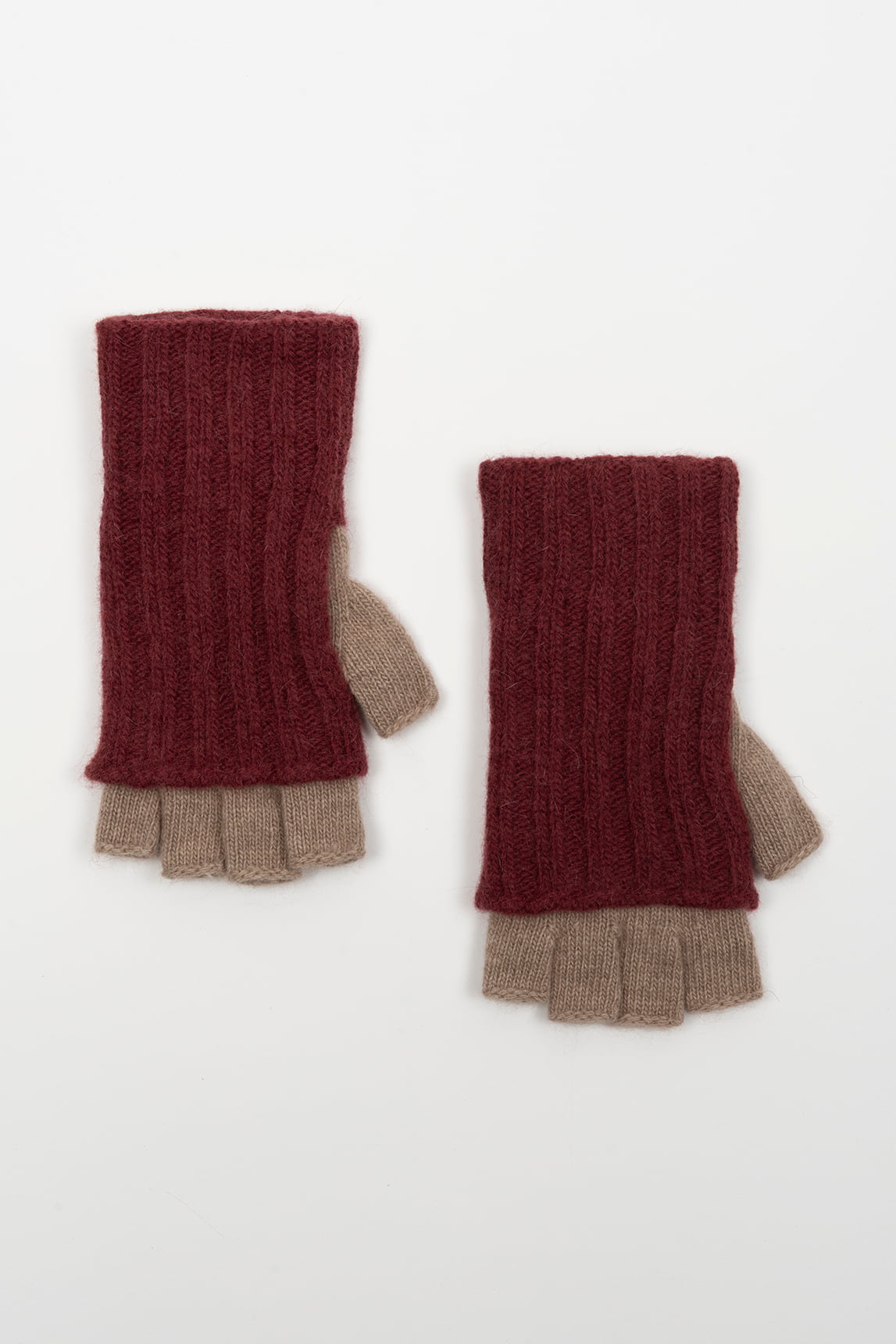 Los guantes Lotte en burdeos y topo aportan calidez y estilo con un diseño tipo mitón pensado para el día a día. La combinación de colores otoñales, con el cuerpo en burdeos profundo y los dedos en beige topo, les da un aire cálido y sofisticado. Su estructura en punto canalé se adapta con suavidad a la mano, mientras que los dedos descubiertos permiten libertad de movimiento y practicidad.