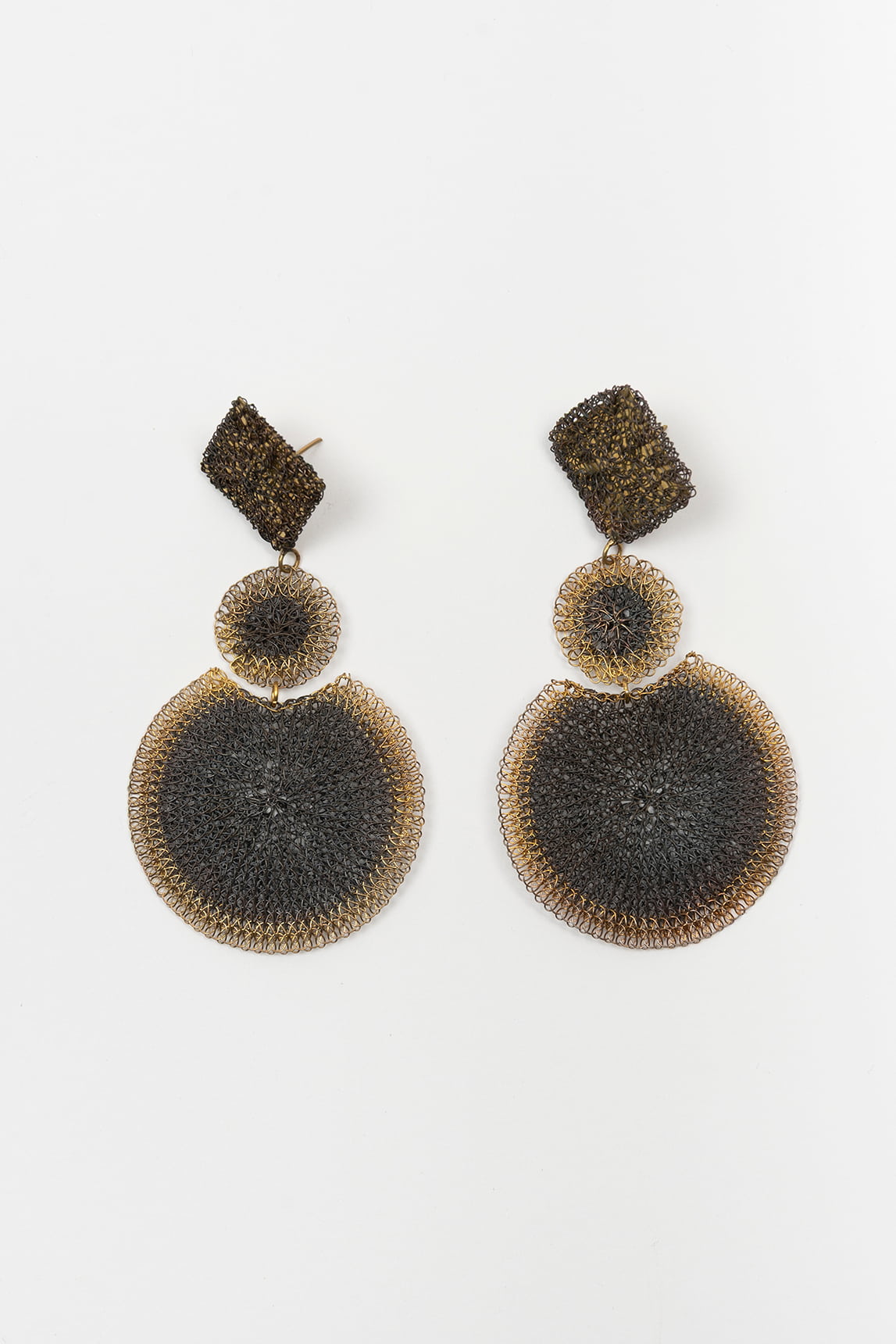 - Geometric earrings made of metal mesh with a two-tone gold and aged gray effect.