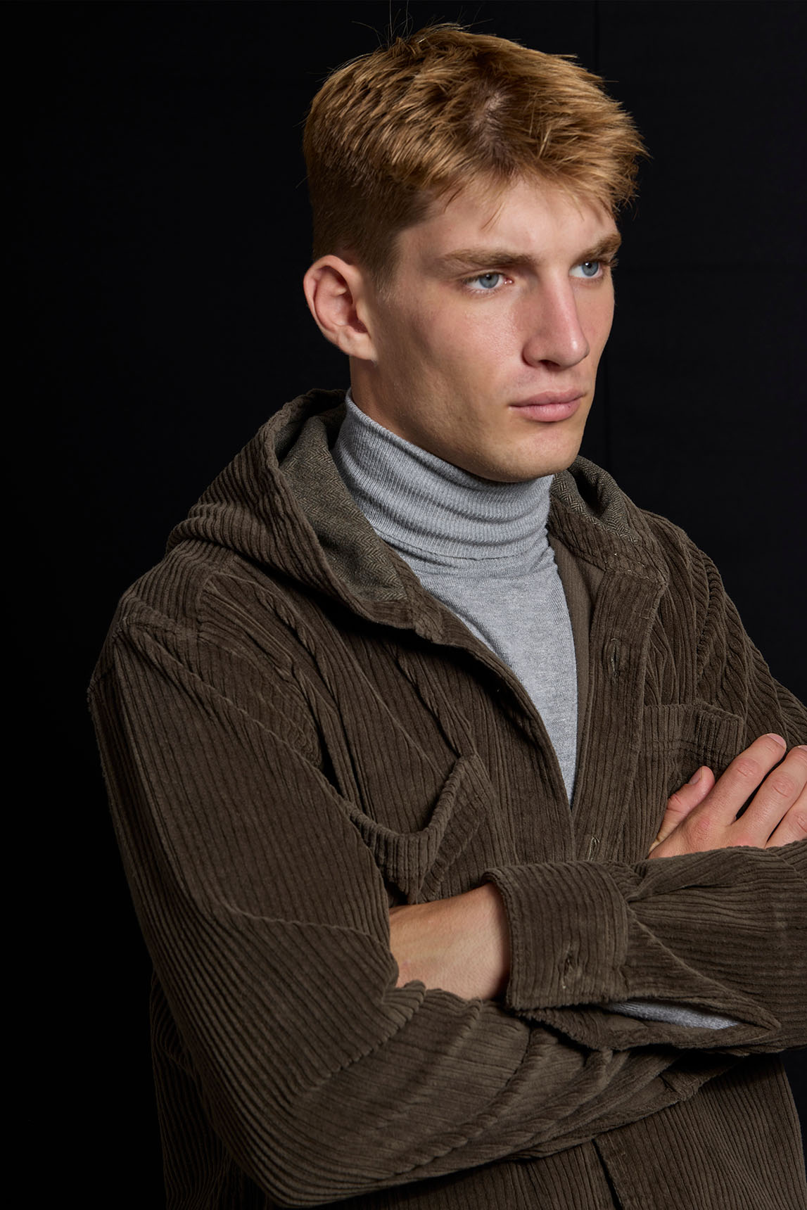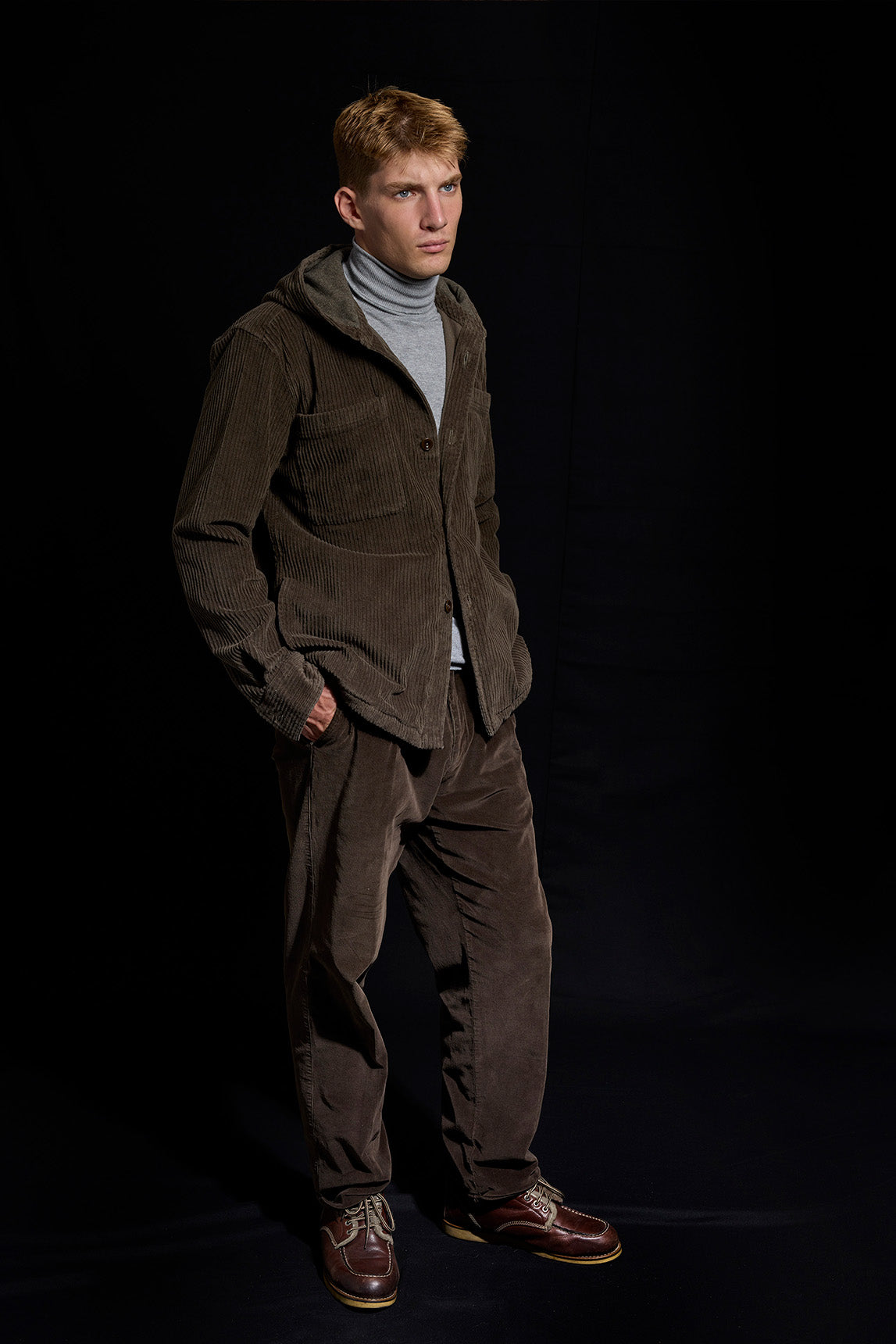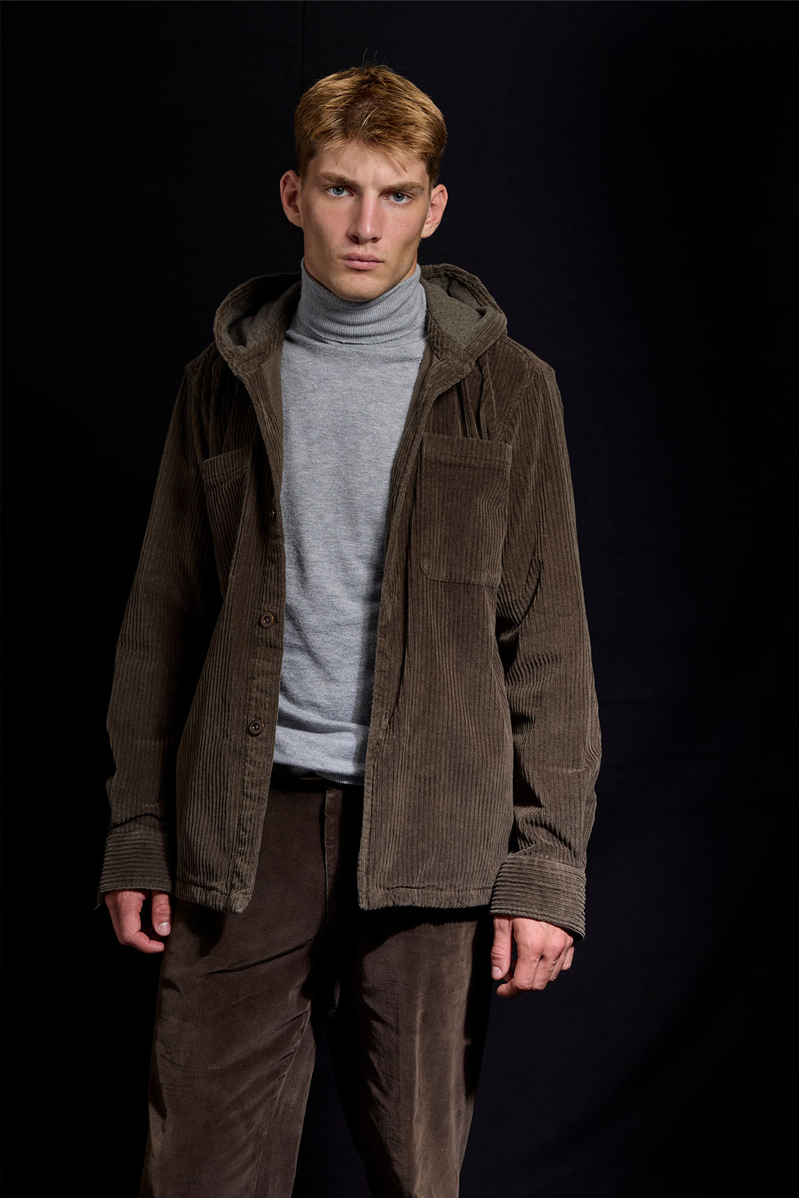 Esta pieza de Koike funciona como camisa gruesa o como sobrecamisa ligera. La pana de canalé y la capucha aportan un aire utilitario y muy actual que queda perfecto sobre camisetas, cuellos cisne o jerséis finos en looks casual de entretiempo.